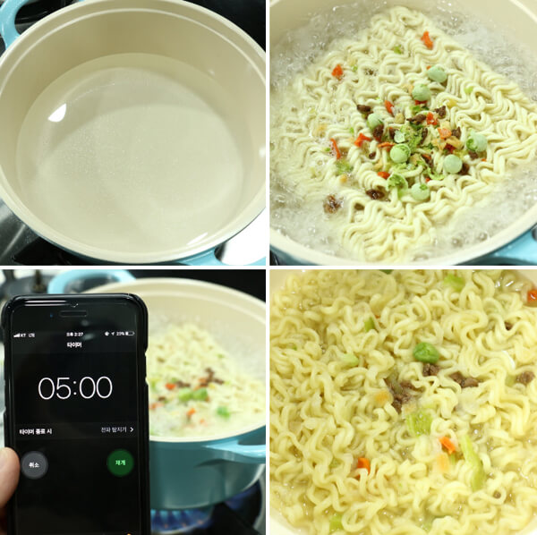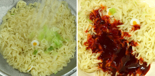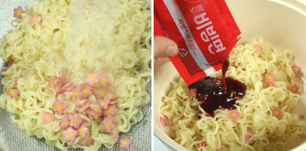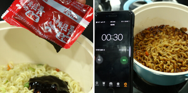 Á¶¸®¹ýÀº ÀÏ¹Ý Â¥Àå¶ó¸é°ú ºñ½ÁÇÏ´Ù. ¸ÕÀú ²ú´Â ¹° 600mlÁ¤µµ¿¡ ¸é°ú ÈÄ·¹ÀÌÅ©¸¦ ³Ö°í ¾à 5ºÐ Á¤µµ ²úÀδÙ. ¸éÀÌ ÀÍÀ¸¸é ¾à°£ÀÇ ¹°À» ³²±â°í µû¶ó ¹ö¸° ÈÄ ¾×»ó½ºÇÁ¸¦ ³Ö°í ¾àÇÑ ºÒ À§¿¡¼ 30ÃÊ Á¤µµ ººÀ¸¸é ¿Ï¼ºµÈ´Ù. À̶§ ¹°Àº ¾Æºü ¼ù°¡¶ôÀ¸·Î 8Å«¼ú, Á¾ÀÌÄÅ 1/2ÄÅ Á¤µµ ³²±â´Â °ÍÀÌ ÁÁ´Ù. ¼¾ ºÒ¿¡ »ì¦ ²úÀ̵íÀÌ ºº¾ÆÁà¾ß dz¹Ì¸¦ »ì¸± ¼ö Àֱ⠶§¹®¿¡ ²À ±â¾ïÇÏÀÚ.