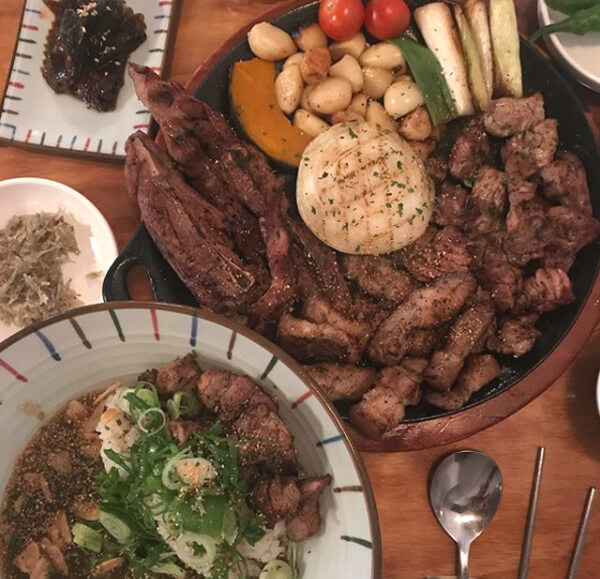 ¿À¸®¿£Å» °æ»óµµ½Ä Ç÷¹ÀÌÆ® °í±êÁý. ½Ã²ø¹÷ÀûÇÑ È«´ë °ñ¸ñ¿¡ Á¶¿ëÈ÷ ÀÚ¸® ÀâÀº ¾Æ´ÁÇÑ ÇÑ¿ÁÁýÀ¸·Î, Á¤Á÷ÇÏ°Ô °¡°Ô À̸§ ÀûÈù °£ÆÇ°ú ºÓÀº º®µ¹ÀÌ ÀλóÀûÀÌ´Ù. °¡°Ô ¾Õ ÀÛÀº ¸¶´çÀº ´ë±â °ø°£À̸ç, ³»ºÎ·Î µé¾î¼¸é 7~8°³ ³²ÁþÇÑ Å×À̺íÀÌ ¸¶·ÃµÇ¾î ÀÖ´Ù. ¸Þ´º´Â 2~3ÀÎ¿ë °í±â ÇÑ»ó°ú 3~4ÀÎ¿ë °í±â Å«»óÀÌ ´ëÇ¥ÀûÀÌ´Ù. ¸Þ´º¸¦ ÁÖ¹®ÇÏ¸é °æ»óµµ½Ä ¹Ø¹ÝÂùÀÌ ¼¼ÆÃµÇ¸ç, ¶ß°Å¿î öÆÇ¿¡ ¾î¸° ¾ç°í±â, »ý»ï°ã»ì, »ý¸ñ»ì ±×¸®°í °¢Á¾ ¾ßä°¡ ¸Ô±â ÁÁ°Ô ±¸¿öÁ® ³ª¿Â´Ù. ¸ñ»ìÁ¤½ÄÀº ½¡ºÒ ¸ñ»ì ±¸ÀÌ¿¡ °æ»óµµ½Ä ¹Ø¹ÝÂù°ú ÁýµÈÀå Âî°³¸¦ ´ã¾Æ³½ Á¤½Ä ½ºÅ¸ÀÏ·Î ·±Ä¡½Ã°£¿¡¸¸ Á¦°øÇÑ´Ù.