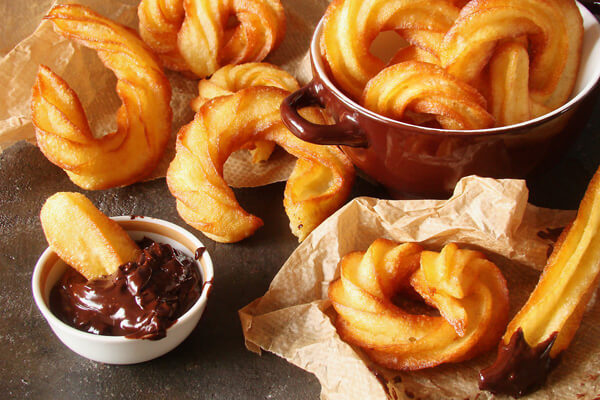 ¿ì¸®³ª¶ó¿¡¼µµ ³îÀ̰ø¿ø ¶Ç´Â ±æ°Å¸® °£½ÄÀ¸·Î ÈçÈ÷ Á¢ÇÏ´Â ¡®Ã߷νº(churros)¡¯´Â ½ºÆäÀÎÀÇ ÀüÅë À½½Ä Áß Çϳª´Ù. ¹Ð°¡·ç ¹ÝÁ×À» ±æÂßÇÏ°Ô ¸¸µé¾î ±â¸§¿¡ Æ¢°Ü³½ ¿ä¸®·Î, ½ºÆäÀο¡¼´Â °£½Ä ¶Ç´Â ¾ÆÄ§ ½Ä»ç·Î ÀÚÁÖ Áñ°Ü ¸Ô´Â´Ù. ¿ì¸®³ª¶ó¿¡¼´Â ¼³ÅÁ ¶Ç´Â °èÇͰ¡·ç¸¦ »Ñ·Á ¸ÔÁö¸¸, ½ºÆäÀο¡¼´Â °« ±¸¿î Ã߷νº¸¦ ÁøÇÑ ÃÊÄݸ´ ½Ã·´¿¡ Âï¾î ¸Ô°Å³ª ÇÖÃÊÄÚ¿Í ÇÔ²² ¸Ô´Â´Ù. ÃÊÄݸ´ ½Ã·´À» µë»Ò Âï¾î ¸Ô´Ù º¸¸é ´ÞÄÞÇÑ ¸À¿¡ ¸Å·áµÇ´Â º°¹Ì ÁßÀÇ º°¹Ì´Ù.