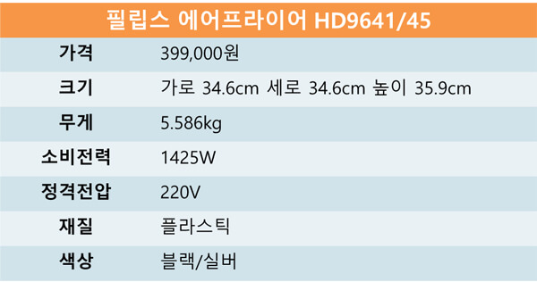 Åͺ¸ ½ºÅ¸ ±â¼úÀº ÀÏ¹Ý ÆÒÀ» »ç¿ëÇÑ ¿¡¾îÇÁ¶óÀÌ¾î º¸´Ù ´õ ºü¸£°Ô Àç·á°¡ ÀÍÀ» »Ó¸¸ ¾Æ´Ï¶ó °£´Ü Á¶ÀÛÀÌ °¡´ÉÇÑ Äü ÄÁÆ®·Ñ ´ÙÀ̾ó, µðÁöÅÐ µð½ºÇ÷¹ÀÌ·Î Çõ½ÅÀ» ½á ³»·Á°¡°í ÀÖ´Â Çʸ³½º ¿¡¾îÇÁ¶óÀ̾î. ¾Æ¿ï·¯ ¿¹¿ ¾øÀÌ ºü¸¥ Á¶¸®°¡ °¡´ÉÇÏ´Ù°í ÇÏ´Ï À̺¸´Ù ´õ ÁÁÀ» ¼ö°¡. ´Ù¾çÇÑ ¿¡¾îÇÁ¶óÀÌ¾î ¶óÀÎ Áß¿¡¼ 4ÀÎ °¡Á·ÀÌ ¸ÔÀ» ¼ö ÀÖÀ» ¸¸Å ³Ë³ËÇÏ°Ô Á¶¸® °¡´ÉÇÑ HD9641/45DÀ» Á÷Á¢ »ç¿ëÇØºÃ´Ù. ±âÁ¸ Á¦Ç°°ú ¿ë·®Àº °°Áö¸¸, »çÀÌÁ 20%³ª ÁÙ¿´´Ù°í ÇÏ´Ï °ø°£ÀÇ Á¦¾à ºÎ´ãµµ ´ú¾ú´Ù.
