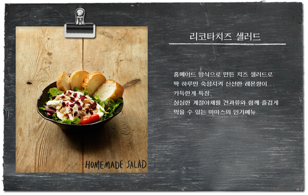 °Ç°ÇÑ Àç·á¸¦ Áß½ÉÀ¸·Î ÇÑ ½Å¼±ÇÑ »ø·¯µå¿Í ÂøÁó ÁÖ½º µîÀ» ¸Àº¼ ¼ö ÀÖ´Â °÷ÀÌ´Ù. »ø·¯µå´Â Áß°£ »çÀÌÁî¿Í Å« »çÀÌÁî Áß ¼±ÅÃÇÑ ÈÄ ¼¸¥ °¡Áö ÀÌ»óÀÌ ÀÖ´Â ÅäÇÎ Áß¿¡ Á÷Á¢ °í¸¦ ¼ö ÀÖÀ¸¸ç ÅäÇÎÀ» °í¸£±â ¾î·Æ´Ù¸é ½ºÀµÎºÎ³ª ¿¬¾î¾Æº¸Ä«µµ µî ±âÁ¸ÀÇ ¸Þ´º¸¦ ¼±ÅÃÇØµµ µÈ´Ù. ¿øÀç·á¸¸À» »ç¿ëÇØ ¸¸µç ÂøÁó ÁÖ½º´Â »ç°úÄÉÀÏ, »ç°ú´ç±Ù µîµµ ÀÖ¾î »ø·¯µå¿Í ÇÔ²² ¸Ô±â ÁÁ´Ù. ä¼Ò¿Í °¢Á¾ Àç·á°¡ ¾Æ³¦¾øÀÌ µé¾î°£ ÂüÄ¡ ºÎ¸®¶Ç¿Í ¿¡±× º£ÀÌÄÁ ·¦Àº ÇÑÁ¤¼ö·®À¸·Î ÆÇ¸ÅÇϰí ÀÖÀ¸´Ï Âü°íÇÏ±æ ¹Ù¶õ´Ù.