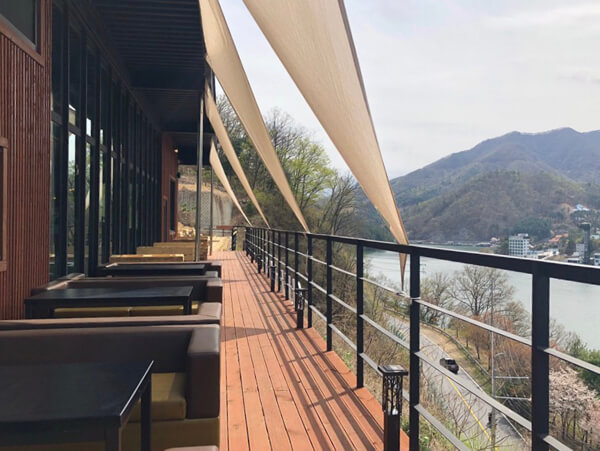 ºóƼÁöÇϰí À̱¹ÀûÀÎ ¿Ü°ü°ú Ä«Æä ¾Õ¿¡ ÆîÃÄÁ® Àִ ûÆò È£¼öÀÇ Ç³°æÀÌ ¸ÚÁø °÷ÀÌ´Ù. »ê°ú È£¼ö°¡ ÇÔ²² ÀÖ´Â ¹Ù±ù dz°æÀº ¾ß¿Ü Å×À̺í»Ó¸¸ ¾Æ´Ï¶ó ½Ç³»¿¡¼µµ Æí¾ÈÇÏ°Ô °¨»óÇÒ ¼ö ÀÖÀ¸¸ç â°¡ ÂÊ¿¡ ¸¶·ÃµÈ ¼ÒÆÄ Á¼®µµ ÀÖ¾î ´õ¿í ÁÁ´Ù. ´Þ´ÞÇÏ°Ô ¸Ô±â ÁÁÀº ¶¥Äὺ¹«µð¿Í ¸Á°í ¿ä°ÅÆ®½º¹«µðºÎÅÍ »óÅÇÑ °úÀÏÁÖ½º¿Í °úÀÏ¿¡ÀÌµå µîÀÇ À½·á°¡ ÀÖÀ¸¸ç ´ç±ÙÄÉÀÌÅ©¿Í ´ÙÅ©ÃÊÄÚ, ÃÊÄÚ¹«½º µîÀÇ ÄÉÀÌÅ©¿Í Çã´Ïºê·¹µå, ÇÁ·»Ä¡Å佺Ʈµµ ÀÖ´Ù. °¡Æò¿¡¼ ¸¸µç ¼öÁ¦ ¸ÆÁÖµµ ÀÖ¾î °£´ÜÇÏ°Ô ¸Ô±â ÁÁ´Ù.