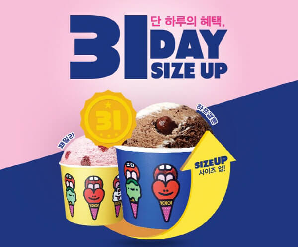 31Àº ¹è½ºÅ²¶óºó½º¸¦ »ó¡ÇÏ´Â ¼ýÀÚ´Ù. ¡®ÇÑ ´Þ ³»³» ¸ÅÀÏ ÇÑ °¡Áö¾¿ ¸ÔÀ» ¼ö ÀÖ´Â 31°¡Áö ¾ÆÀ̽ºÅ©¸²À» °®Ãè´Ù¡¯´Â Àǹ̰¡ ºê·£µå¸í¿¡ ´ã°ÜÀֱ⠶§¹®ÀÌ´Ù. ±×·¡¼ ¿ì¸®³ª¶ó¿¡¼ ÀÌ ºê·£µå´Â ¡®¹è½ºÅ²¶óºó½º31¡¯À̶ó°í ÁÖ·Î ºÒ¸°´Ù. Áß¿äÇÑ Àǹ̸¦ ´ãÀº ¼ýÀÚÀÎ ¸¸Å, µÎ ´Þ¿¡ ÇÑ ¹ø¾¿ µ¹¾Æ¿À´Â 31ÀÏ¿¡ ¹è½ºÅ²¶óºó½º¿¡¼´Â À̺¥Æ®¸¦ ÁøÇàÇÑ´Ù. 31ÀÏ¿¡ ÁÖ¹®ÇÒ °æ¿ì¿¡´Â ¹«·á 1 »çÀÌÁî¾÷ÀÌ ÀÌ·ïÁö´Ï, ³õÄ¡Áö ¾Ê±â¸¦ ¹Ù¶õ´Ù.