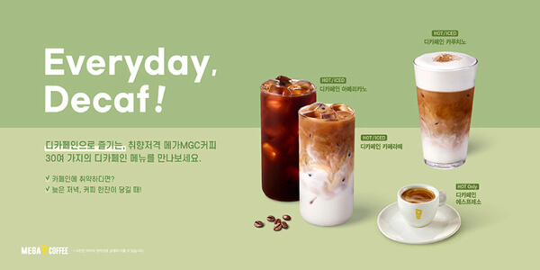 ¸Þ°¡Ä¿ÇÇ´Â ´Ù¾çÇÑ ¼ö¿ä¸¦ °í·ÁÇØ ±âÁ¸ ¿¡½ºÇÁ·¹¼Ò À½·á¸¦ µðÄ«ÆäÀÎÀ¸·Î ÀüȯÇÑ 29Á¾·ùÀÇ µðÄ«ÆäÀÎ À½·á¸¦ µµÀÔÇß´Ù. ¸À°ú ÇâÀ» À¯ÁöÇϱâ À§ÇØ ±¹³» ·Î½ºÆÃ ÇÁ¸®¹Ì¾ö µðÄ«ÆäÀÎ ¿øµÎ¸¦ »ç¿ëÇßÀ¸¸ç, ¼¦ ÃßÃâ ¹æ½ÄÀ¸·Î ÃßÃâ ¹× Á¦Á¶ÇØ ´õġĿÇdzª Äݵåºê·çº¸´Ù Ä«ÆäÀÎ ÇÔ·®À» ³·Ãè´Ù. ´öºÐ¿¡ Ä¿ÇÇ º»¿¬ÀÇ ¸ÀÀ» °í½º¶õÈ÷ ´À³¥ ¼ö ÀÖ´Ù. µðÄ«ÆäÀÎ Ä«Æä¶ó¶¼´Â ¶ß°Å¿î À½·á¿Í ¾ÆÀ̽º ¸ðµÎ ÁÖ¹® °¡´ÉÇϸç, °¡°ÝÀº 3,900¿øÀÌ´Ù.