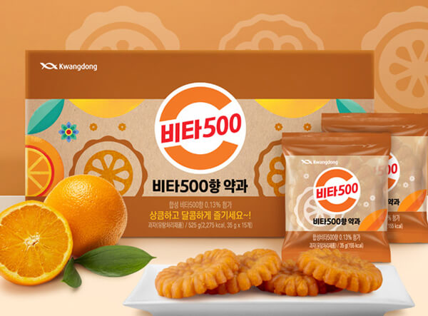 ¾à°ú¿Í´Â »ó°üÀÌ ¾øÀ» °Í °°Àº ȸ»çÀÎ ±¤µ¿Á¦¾àÀÌ Æ¯ÀÌÇÑ ÄܼÁÆ®ÀÇ ¾à°ú¸¦ Ãâ½ÃÇß´Ù. ¡®ºñŸ500Çâ ¾à°ú¡¯°¡ ¹Ù·Î ±×°ÍÀÌ´Ù. ÀÌ Á¦Ç°Àº À̸§Ã³·³ ºñŸ500 À½·áÀÇ Æ¯º°ÇÑ ÇâÀ» ÷°¡ÇÑ ¾à°ú Á¦Ç°ÀÌ´Ù. Â˵æÇÑ ½Ä°¨À» °¡Áø ¾à°ú¿¡ »óÅÇÑ ¿À·»Áö ÆäÀ̽ºÆ®¿Í ºñŸ500ÀÇ ÇâÀ» ³Ö¾î¼, »õÄÞ´ÞÄÞÇÑ ¸ÀÀ» Áñ±æ ¼ö ÀÖ´Â ¾à°ú´Ù. ÇѰú Àü¹® Á¦Á¶±â¾÷ÀΠȣÁ¤°¡¿¡¼ ¸¸µå´Â Á¦Ç°ÀÌ´Ù. 15°³°¡ µç ÆÐŰÁö ÇϳªÀÇ ÆÇ¸Å°¡´Â 19,900¿øÀÌ´Ù.