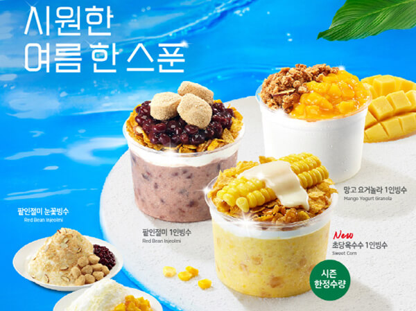 À̵ð¾ßÄ¿ÇÇ´Â ºù¼ö ¸Þ´º 5Á¾À» »õ·Ó°Ô ¼±º¸¿´´Ù. ½ÅÁ¦Ç°Àº ¡®´«²Éºù¼ö¡¯ 2Á¾°ú ¡®1Àκù¼ö¡¯ 3Á¾À¸·Î ±¸¼ºµÆ´Ù. ´«²Éºù¼ö´Â ¡®ÆÏÀÎÀý¹Ì ´«²Éºù¼ö¡¯¿Í ¡®¾ÖÇøÁ°í ´«²Éºù¼ö¡¯ÀÇ 2Á¾ÀÌ´Ù. ÆÏÀÎÀý¹Ì ´«²Éºù¼ö´Â ÀÎÀý¹Ì¿Í ±¹»ê ÆÏÀ» ¿Ã·Á °í¼ÒÇÏ°í ´ÞÄÞÇÑ ¸ÀÀÌ Æ¯Â¡ÀÌ´Ù. ¾ÖÇøÁ°í ´«²Éºù¼ö´Â ºÎµå·¯¿î ¿ìÀ¯ ¾óÀ½°ú ¸Á°íÀÇ Á¶È·Î ¿´ë °úÀÏ Æ¯À¯ÀÇ »õÄÞ´ÞÄÞÇÔÀ» ´À³¥ ¼ö ÀÖ´Ù. 1Àκù¼ö´Â ÇÕ¸®ÀûÀÎ °¡°Ý¿¡ ºÎ´ã ¾øÀÌ ºù¼ö¸¦ Áñ±æ ¼ö ÀÖ´Â Á¦Ç° 3Á¾À¸·Î ±¸¼ºµÆ´Ù. ´ëÇ¥ ¸Þ´º·Î ²ÅÀ» ¼ö ÀÖ´Â ÆÏÀÎÀý¹Ì ´«²Éºù¼öÀÇ ¸ÅÀå ÆÇ¸Å°¡´Â 11,800¿øÀÌ´Ù.
