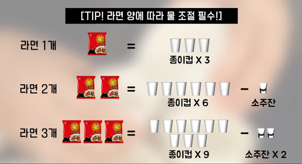TIP : ¶ó¸é 1°³¸¦ ²úÀÏ ¶§´Â Á¾ÀÌÄÅ °¡µæ ä¿î ¹° 3ÀÜÀÌ¸é µÈ´Ù. ±×·±µ¥ ¶ó¸é 2°³¸¦ ²úÀÏ ¶§´Â Á¾ÀÌÄÅ °¡µæ ä¿î ¹° 6ÀÜ¿¡¼ ¼ÒÁÖÄÅÀ¸·Î ÇÑÀÜ Á¤µµ¸¦ ´ú¾î³»´Â °ÍÀÌ ÁÁ´Ù. ¶ó¸é 3°³¸¦ ²úÀÏ ¶§´Â Á¾ÀÌÄÅ °¡µæ ä¿î ¹° 9ÀÜ¿¡¼ ¼ÒÁÖ ÄÅÀ¸·Î µÎ ÀÜÀ» ´ú¾î³½´Ù. ¹°ÀÇ ¾çÀÌ ¸¹¾ÆÁú¼ö·Ï Áõ¹ß·®ÀÌ Àû¾îÁö±â ¶§¹®¿¡ Á¶±Ý ´ú¾îÁÖÁö ¾ÊÀ¸¸é ±¹¹°ÀÌ ½Ì°Å¿öÁø´Ù.